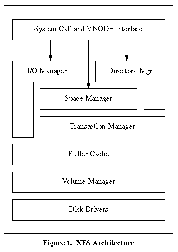 XFS is modularized into several parts, each of which is responsible for a separate piece of the file system's functionality. The central and most important piece of the file system is the space manager. This module manages the file system free space, the allocation of inodes, and the allocation of space within individual files. The I/O manager is responsible for satisfying file I/O requests and depends on the space manager for allocating and keeping track of space for files. The directory manager implements the XFS file system name space. The buffer cache is used by all of these pieces to cache the contents of frequently accessed blocks from the underlying volume in memory. It is an integrated page and file cache shared by all file systems in the kernel. The transaction manager is used by the other pieces of the file system to make all updates to the metadata of the file system atomic. This enables the quick recovery of the file system after a crash. While the XFS implementation is modular, it is also large and complex. The current implementation is over 50,000 lines of C code, while the EFS implementation is approximately 12,000 lines.